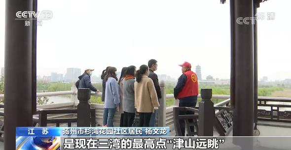 江苏扬州杉湾花园社区居民 杨文龙:我们处的这个位置是现在三湾的最高点“津山远眺”,像现在这个春天,我们大家看到可以说是繁花似锦,古运河的水是非常清澈……