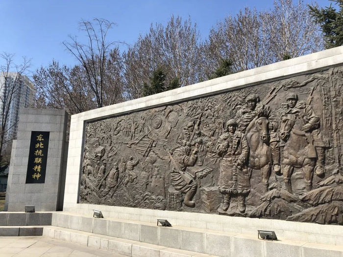 “东北抗日暨爱国自卫战争烈士纪念塔”由塔基、塔身和塔顶组成,通高35米。塔身为花岗岩质,阶梯式的构造侧面看有奔向前方的动态,正面看又有笔直向上的趋势。塔顶置八一红星,塔下是战士英勇杀敌和群众积极支前场面的浮雕。