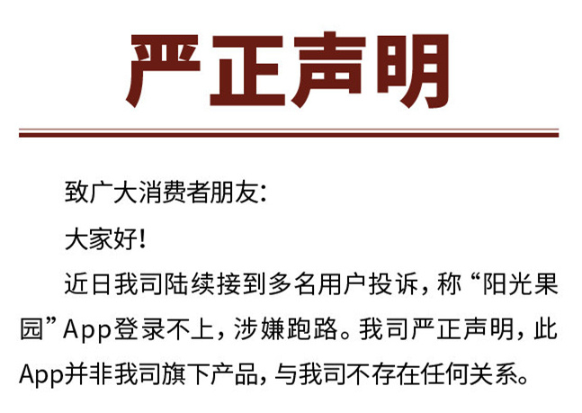 当然,“阳光果园”的设计者是不会让参与者拿到“年化”的。本月初,“阳光果园”关掉了App,卷钱跑路了。经查询,运营阳光果园的广州市百果园信息技术有限公司已无法联系。该公司又与知名水果品牌“百果园”撞名,百果园集团声明,自己与广州百果园无任何关联。