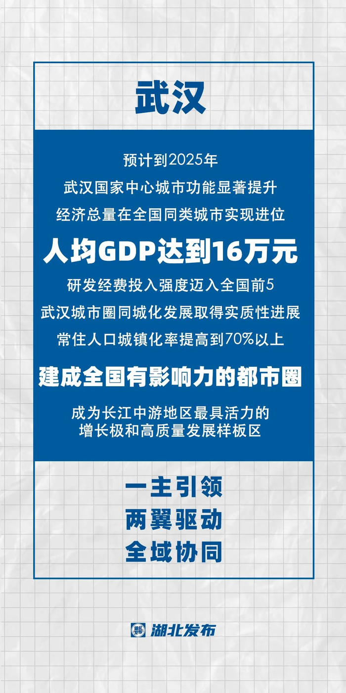做强武汉龙头地位,全面提升城市能级。聚焦“打造五个中心、建设现代化大武汉”,构建“主城做优、四副做强、城乡一体、融合发展”空间发展格局。