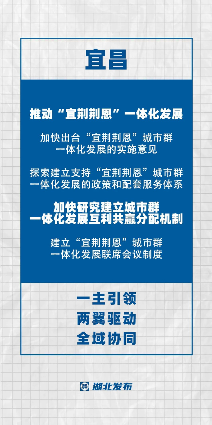 在顶层设计层面,会同荆州、荆门、恩施加快出台“宜荆荆恩”城市群一体化发展的实施意见、三年行动计划以及2021年度工作要点,明确时间表和任务图;在政策支撑层面,探索建立支持“宜荆荆恩”城市群一体化发展的政策和配套服务体系,加大土地、人才、资金、财政税收、行政管理等政策扶持力度,加快研究建立城市群一体化发展互利共赢分配机制;在工作机制层面,建立“宜荆荆恩”城市群一体化发展联席会议制度,定期协调对接,推动工作落实。