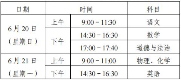 恢复中考原有时间安排,同时恢复体育测试和理化生实验操作技能考查。具体中考文化课考试时间为6月20-21日,科目为语文、数学、英语(含听力测试)、物理化学(合卷)、道德与法治。