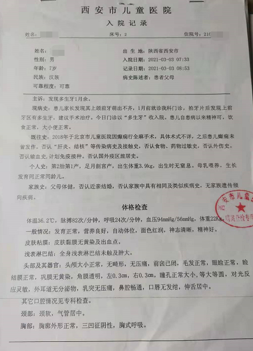 “患儿家长发现其上颌前牙萌出不齐,1月前就诊我科门诊,拍牙片后发现上前牙区有多生牙,建议手术治疗。今日(3月3日)门诊以‘多生牙’收入院。患儿自患病以来精神可,饮食正常,大小便正常。”