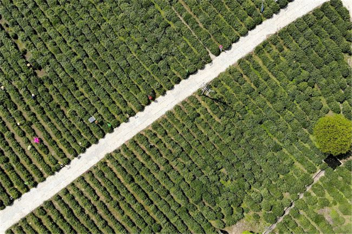 4月10日,茶农在泾县汀溪乡生态茶园内采茶(无人机照片)。新华社记者 黄博涵 摄
