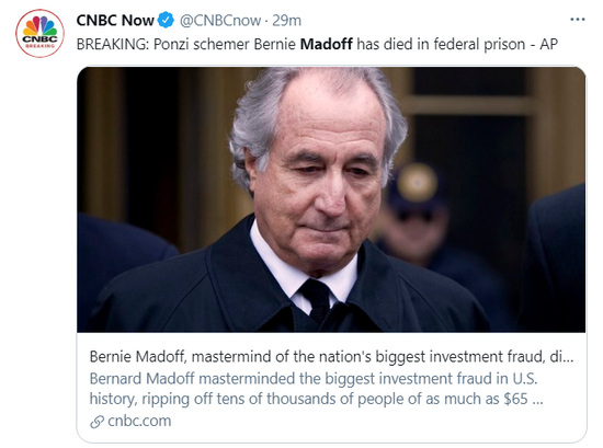 原标题:美媒:美国史上最大庞氏骗局主犯麦道夫死亡