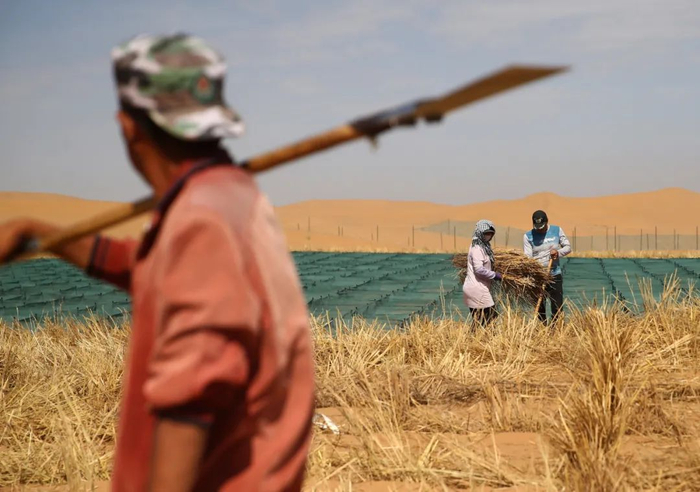 治沙工人在穿越腾格里沙漠腹地的乌玛高速青铜峡至中卫段扎草方格。贾浩成摄(新华社)