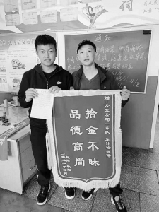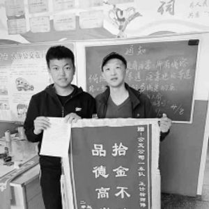 赵阳怀着感恩的心立马去学校门口做了一面锦旗,当天就将写有“拾金不昧,品德高尚”字样的锦旗送了过去。“这种热心肠深深地触动了我,他是这个社会弘扬正能量的榜样,是我们即将步入社会的学生学习的榜样……”赵阳将这封感谢信一并交到王计栓的手中。