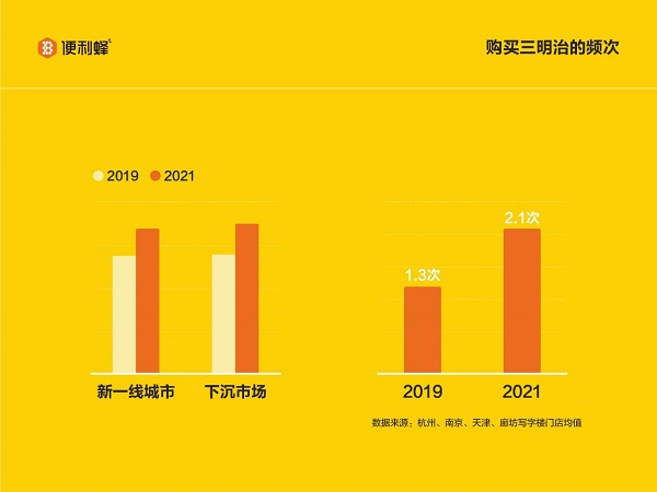 “Z世代”无疑最受关注。便利蜂方面称,2019年全年、2020年全年和2021年第一季度,三明治的销量整体一直在稳步提升,在早餐时间段已“晋升”为“民生基本品”之一。伴随销量整体增长的是“Z世代”消费群体人数的增长,并成为过去两年多时间内增长最快的三明治消费群体。“三明治覆盖了00后生活作息的三个时间段:早餐、傍晚放学后和夜宵时间段。在夜宵时间段,因为距离近、相对低卡等特点,三明治成为00后学校周边便利蜂门店的首选商品。”