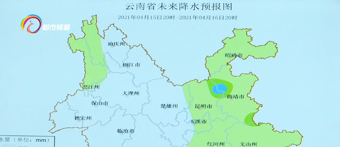 4月15日20时--4月16日08时:昭通北部中雨;昭通中部以南、曲靖、文山、红河中部以南小雨;怒江北部阵雨;曲靖南部阴;昆明西部、玉溪中部以西、楚雄、普洱北部、临沧、保山东部、大理东部晴;其它地区多云。