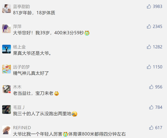 黄须进表示,运动让他的生活充满了快乐,如果当天跑步成绩好,他会愉快一整天。他也希望有更多相同爱好的同龄人能加入田径运动,“作为老年人,健身强体就是对国家最好的贡献”。