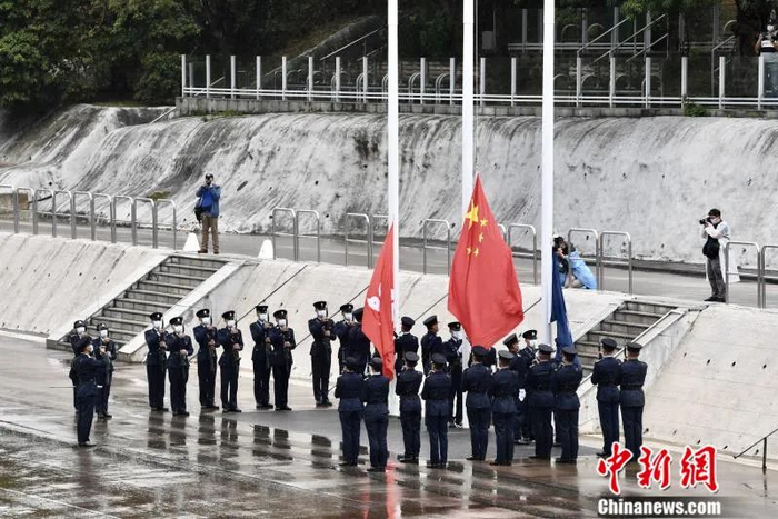 上午10时许,在香港警察学院的操场上,在香港警察乐队奏响《歌唱祖国》的雄壮乐曲中,数十名仪仗队员迈着整齐划一的中式步操举行升旗仪式。尤为引人瞩目的,是护旗手肩扛五星红旗、香港区旗、香港警队队旗走在队伍的前列,一改以往英式升旗礼护旗手手捧旗帜入场的惯例。