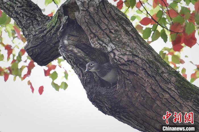 中新网杭州4月15日电 (江杨烨)最近,正是国家二级保护动物鸳鸯的繁殖期。4月15日,记者从浙江杭州西湖鸳鸯护卫队获悉,该护卫队首次发现,鸳鸯在西湖边的香樟树洞里筑巢。