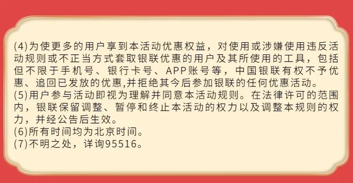 ⑤获赠优惠券可在云闪付APP右下角“我的”—“奖励”—“我的票券”中查看。
