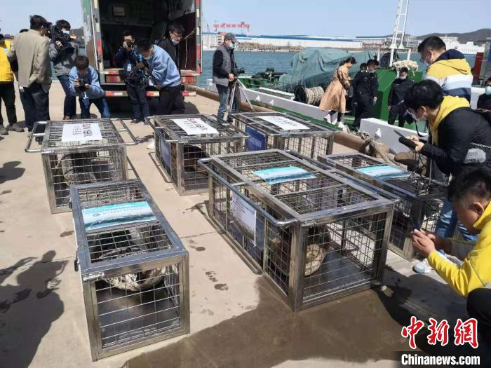 原标题:大连:8只斑海豹被放归大海 首次大规模放归人工繁育斑海豹