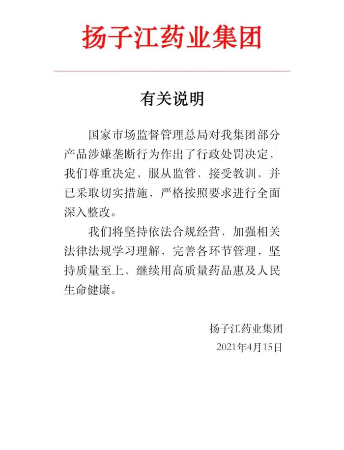 在对扬子江药业的处罚公告中,国家市场监管总局也强调,药品价格关系国计民生,涉及减轻群众就医负担、增进民生福祉等重大问题,市场监管总局将持续加强医药领域反垄断执法,有效预防和制止垄断行为,切实保护市场公平竞争,维护消费者合法权益和社会公共利益,促进社会主义市场经济健康发展。