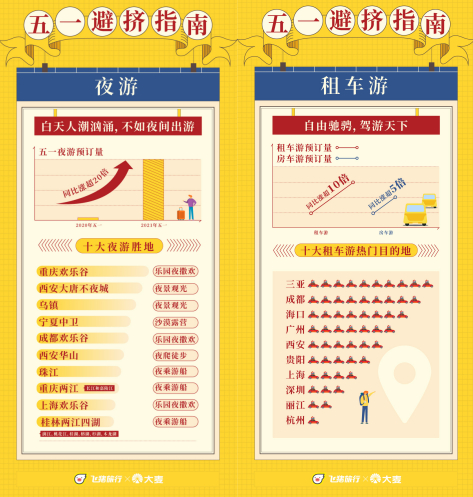 一车一家的租车游既安全卫生又私密少接触,飞猪五一租车游预订量同比涨超10倍。三亚、成都、海口、广州、西安、贵阳、上海、深圳、西安、丽江、杭州成为自驾游热门城市。飞猪同步上线的五一租车大促最高可立减200元。“睡进风景中”的房车游持续蹿红,预订量同比涨超540%。