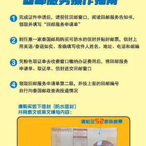 二、申请流程:申请人在驻泰使馆领事证件大厅办理完护照颁、换、补发申请后,可在大厅回邮窗口自愿提出回邮服务申请,并按相关要求填写相关申请材料、预缴证件费用并递交回邮信封。申请人可在来馆前预先在所在地附近邮局提前购买已付足邮资并写清收件人姓名、地址、电话的泰国邮政EMS信封。详细流程请参见《回邮服务操作指南》