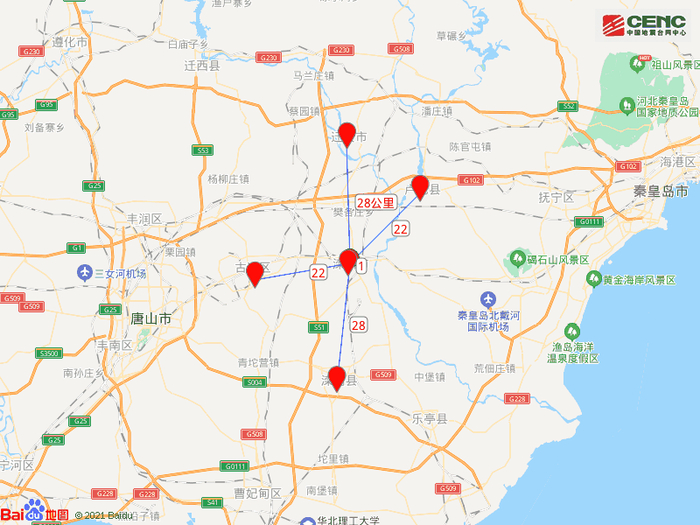 周边县城:震中距滦州市1公里、距卢龙县22公里、距古冶区22公里、距滦南县28公里、距迁安市28公里,距唐山市47公里,距天津市150公里。