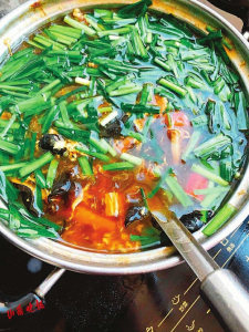 金针、木耳用水泡开洗净,切好和肉片连同原煮肉的汤一齐倒入锅内,再加上酱油使汤成金黄色。另将粉面用水拌成糊汁,慢慢倒入锅内搅匀,同时把鸡蛋打在碗内搅匀,细细地流入锅内,随即把锅端下。另用一炒瓢将猪油烘热加葱、花椒炸成花椒油,用勺子把全卤搅匀加上姜末后,即把炸好的花椒油浇在卤内,再加工上芽韭、虾米即成。
