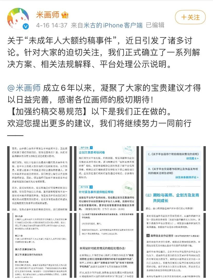 针对“13岁女孩70万约稿买画风波”,约稿平台“米画师”官方微博4月16日下午发布声明称,该平台正式确立了一系列解决方案、相关法规解释和平台处理公示说明,目前平台企划方用户(买家)需要实名认证。