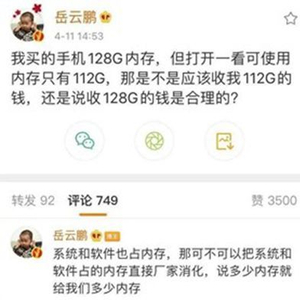 央广网北京4月17日消息 据中央广播电视总台中国之声《新闻超链接》报道,近日,相声演员岳云鹏发微博称自己购买了一部128G内存的手机,使用时却发现内存只有112G。他进一步追问:“是不是应该收我112G的钱,还是说收128G的钱是合理的?”