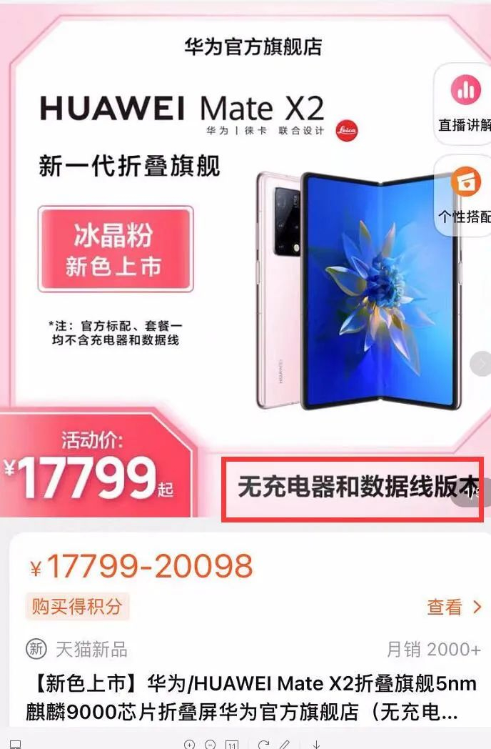 目前在华为网店上也已经可以看到MateX2无充电器版本上架,降价200元。