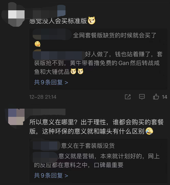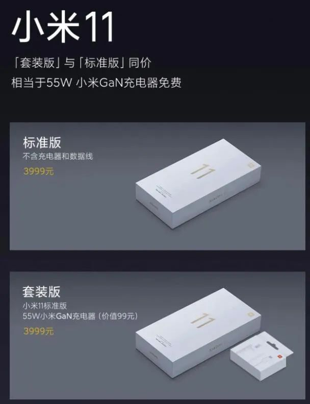在苹果的做法影响下,国内手机厂商最先跟进的是小米手机。2020年12月28日,小米11新品发布会中,小米也推出不含充电器和数据线的“标准版”。但小米选择了一个折中方案,除了不含充电器的版本,也有附赠55W氮化镓充电器“套装版”,两个版本可自由挑选,价格一样。