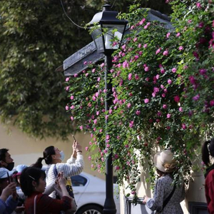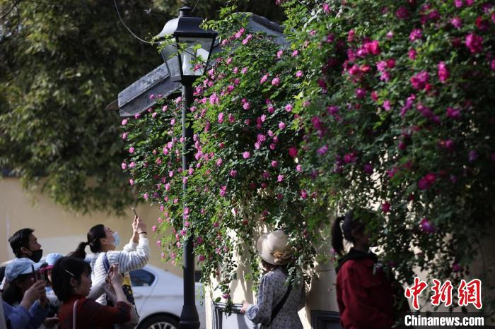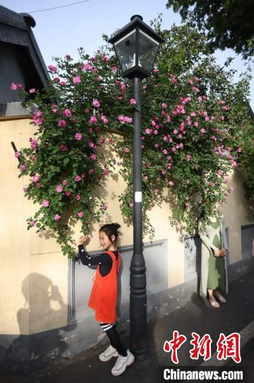 4月17日,江苏省南京市,市民在颐和路历史建筑群围墙边拍摄照片。近日,这里生长的花卉植物从墙内延伸到墙外,独特的景致成为了当地一处“网红打卡地”。