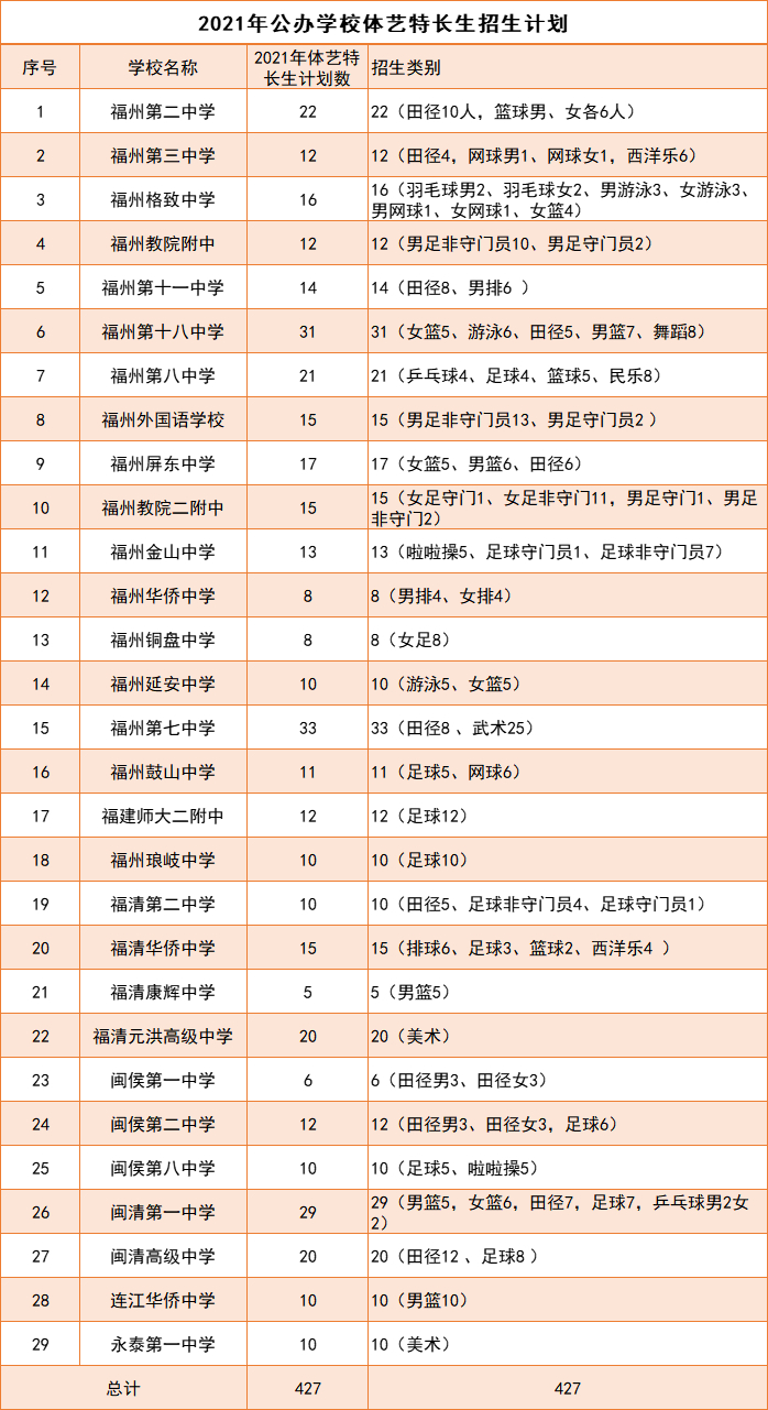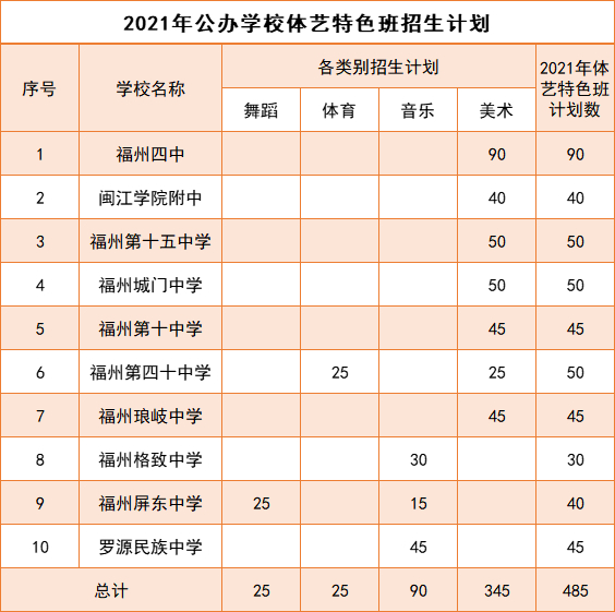 1.所有报考福州市2021年公办学校普通高中体育、艺术特色班、特长生招生的考生均要参加报考学校组织的专业入围测试和2021年福州市中考。报考体育、艺术特色班在中招提前批录取。报考体育、艺术特长生在中招第一批录取,招生代码与普高普通班的代码一致。