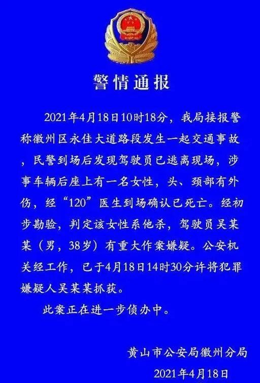 4月18日,安徽黄山徽州区警方通报“交通事故车辆中发现女尸”:经初步勘验,该女性系他杀,驾驶员吴某某有重大作案嫌疑;警方已将吴某某抓获,此案正在进一步侦办中。