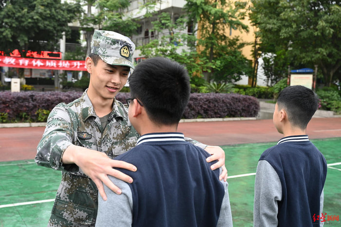 学生们口中的“小王”本名王康力,来自重庆永川,是此次该校开展全人品格教育体质提升训练营的一名教官,长相清秀,笑起来两颊的酒窝若隐若现。性格开朗的他在没有训练的日子里,总能与学生们打成一片。一位性格腼腆的男生对王教官给出这样的评价:“他眼神柔中带刚,既有着传统男人的温柔,又有着军人的一丝刚气,太少见了……”