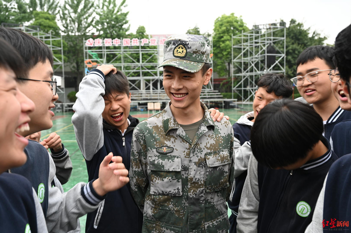 近日,一名军训教官在成都市建筑职业中专校内引起“轩然大波”。这位在学生眼中酷似宋仲基、玄彬、李易峰等多位明星的小王教官只要一出现,就受到学生们的热烈欢迎。虽然只与教官相处了几日,但在离别的日子里,学生们都舍不得他走,将他团团围住,“留下来吧,王教官!”