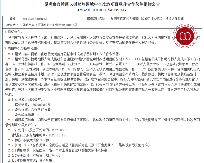 招标内容:昆明市官渡区大树营片区城中村改造项目前期工作的合作伙伴。