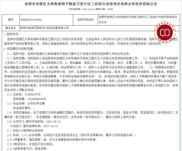 招标条件:昆明市官渡区大树营片区城中村改造项目,已由昆明市人民政府办公室公文处理笺批准实施,招标人为昆明市官渡区国有资产投资经营有限公司。项目已具备招标条件,现对该项目合作伙伴进行公开招标。