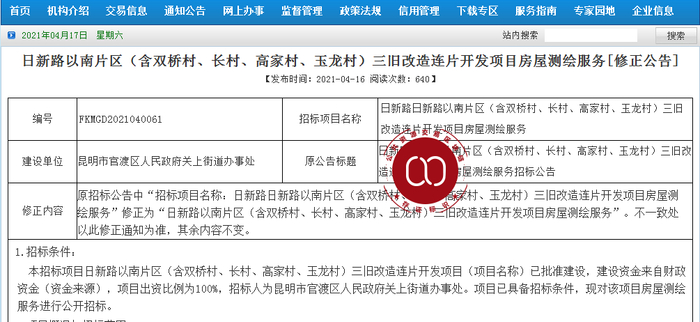 昆明市官渡区人民政府关上街道办事处4月16日发布日新路以南片区(含双桥村、长村、高家村、玉龙村)三旧改造连片开发项目房屋测绘服务修正公告。