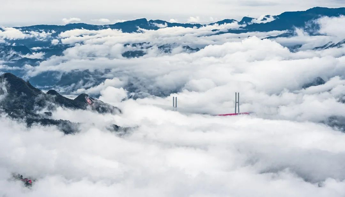 高山云雾与北盘江大桥构成的画卷。