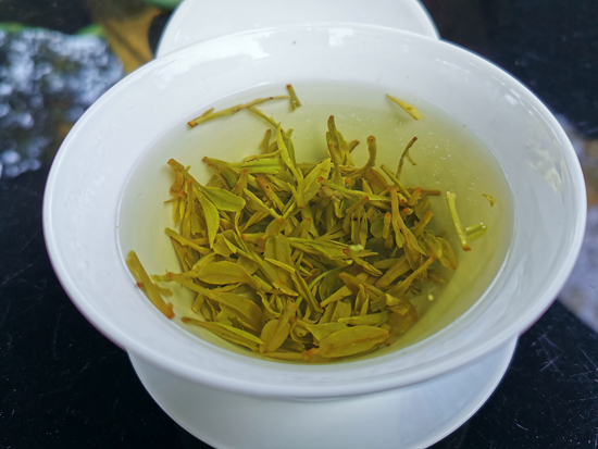 经过冲泡的龙井群体种与龙井43也各有特色。群体种冲泡出的茶叶较为卷曲,而龙井43冲泡后茶叶挺拔、修长,颜色明丽,观赏性更强。在口感上,龙井43几乎无涩味,香气为豆花香,茶汤杂质少,比较容易被大部分人接受。群体种除了具有豆花香,还带有花果香,饮下后,清香中略带几分苦涩,口感浓郁而丰富。除了风味出众,西湖龙井茶还含有较多的茶多酚、维生素C等营养物质。