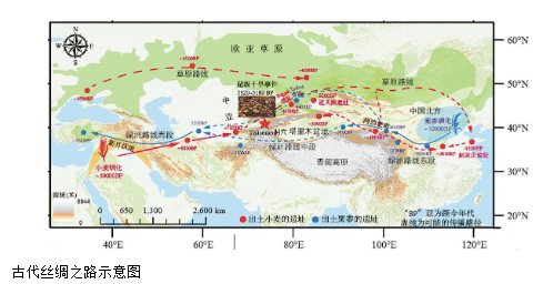 小麦最早在西亚的黎凡特和安纳托利亚地区驯化,时间稍早于1万年前,随后迅速覆盖了肥沃新月形地带,并跟随农业人群的迁徙向周边地区扩张。其中向东的一支在约8000年前传到土库曼斯坦。经过古人足迹认证,再向东适合的路线有两条:一条是绕过帕米尔高原,向北顺着天山经过阿尔泰山,到达欧亚草原;另一条通过瓦罕走廊或者费尔甘纳盆地经吉尔吉斯斯坦,翻过天山沿着塔里木盆地边缘绿洲进入河西走廊。