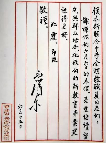 来到校史馆门口,红色大字的毛泽东主席复信墙格外引人注目。那是在1949年新中国成立前夕,6月6日是当时的教师节,解放战争捷报频传,全校教职工欢庆节日,群情振奋。时任白潞校长与教师们共议,给毛主席写封致敬信,表达为新教育事业奋斗的决心。大家对此纷纷表示赞同,45名教职员签名的致敬信连夜写成寄往北京。6月25日,毛主席亲笔复信,并勉励佳木斯联合中学的全体教职员同志,“望继续努力,与群众结合,把我们的新教育事业建设得更好”。