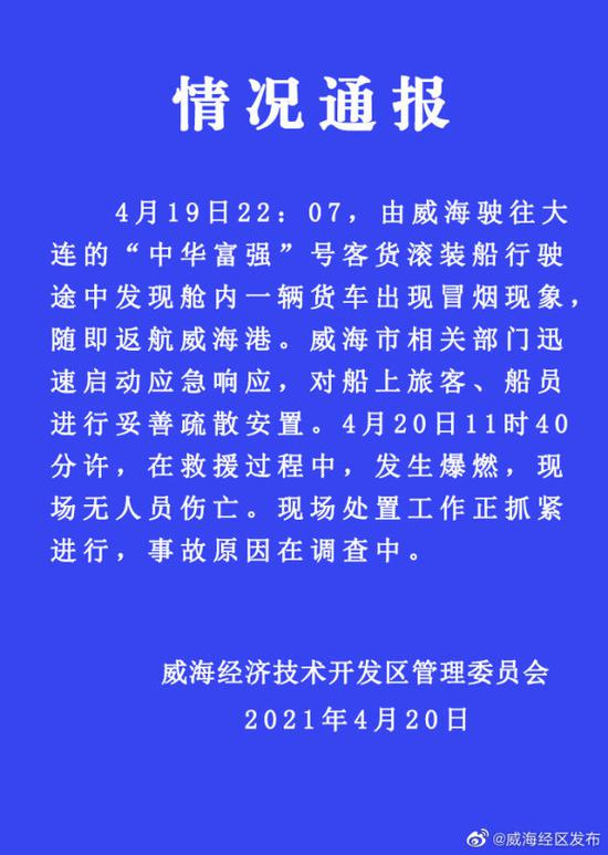 据@威海经区发布,4月19日22:07,由威海驶往大连的“中华富强”号客货滚装船行驶途中发现舱内一辆货车出现冒烟现象,随即返航威海港。威海市相关部门迅速启动应急响应,对船上旅客、船员进行妥善疏散安置。4月20日11时40分许,在救援过程中,发生爆燃,现场无人员伤亡。现场处置工作正抓紧进行,事故原因在调查中。