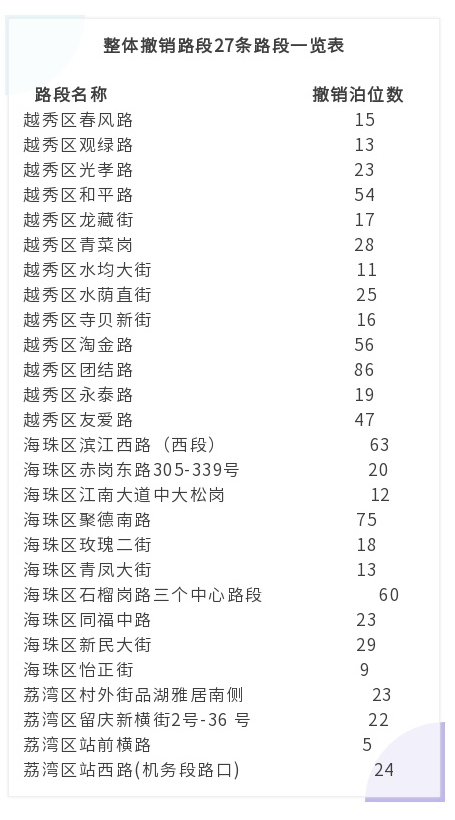此次调整,对越秀区整体撤销泊位路段13条,撤销泊位410个,主要涉及到的路段包括春风路、观绿路、龙藏街、寺贝新街等。