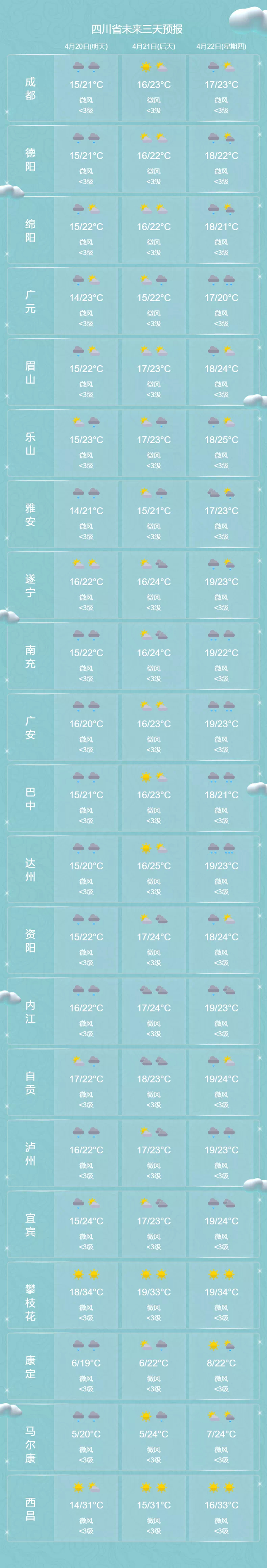 21日晚上到22日白天:盆地各市晴转多云,其中西部沿山有分散小雨;川西高原和攀西地区晴间多云。