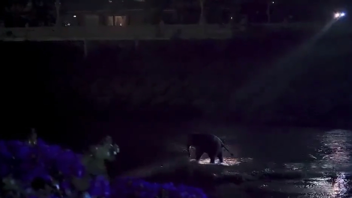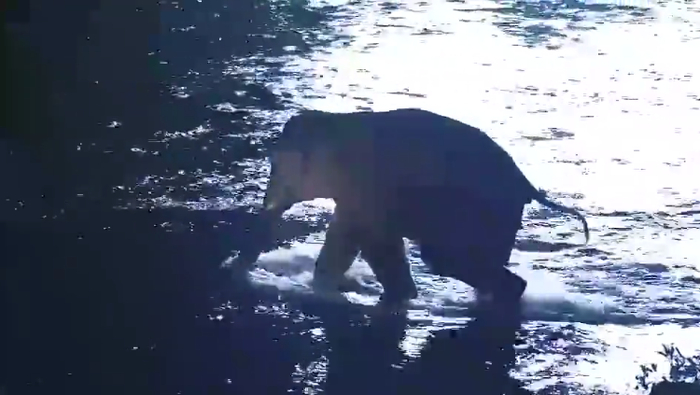 4月19日21点左右,独象从灌木林出来徒步到泼水广场旁,沿着南腊河觅食活动,在多个部门联合监测下,并未造成人员伤亡情况。