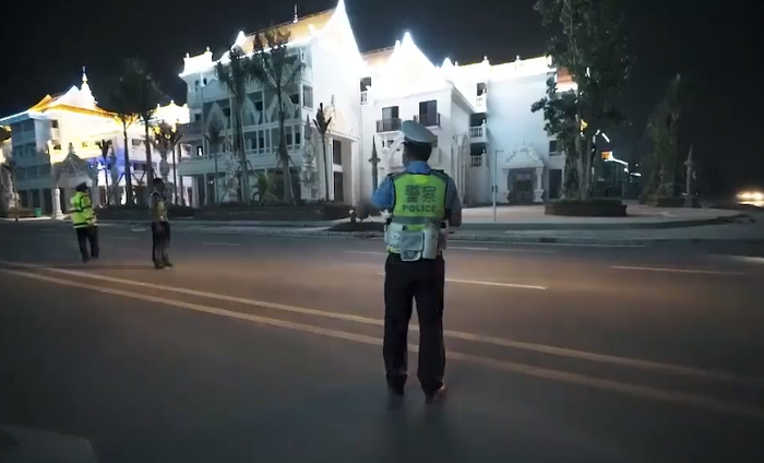 为防止独象上路造成危险,工作人员紧急疏散围观人群,勐腊县交警大队疏理道路上车辆情况,并进行交通管制。
