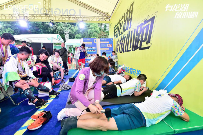 龙湖在现场服务区准备了饮料、水果等组成的赛后补给包,助力每一位参赛业主驱走赛后疲乏。重庆龙湖特有并延续至今年的业主赛后恢复服务,由旗下专业康复医疗机构瑞海贝提供,其中包含了运动损伤的康复咨询,以及DMS筋枪按摩、肌肉放松等项目。