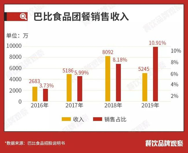 巴比食品招股说明书显示,报告期内其公司主营业务收入分为三部分:特许加盟销售、直营门店销售和团餐销售。其中特许加盟销售稳定发展,占比近90%;团餐的占比则提升迅速,2016年仅为3.76%,2019年上半年占比就超过了10%。