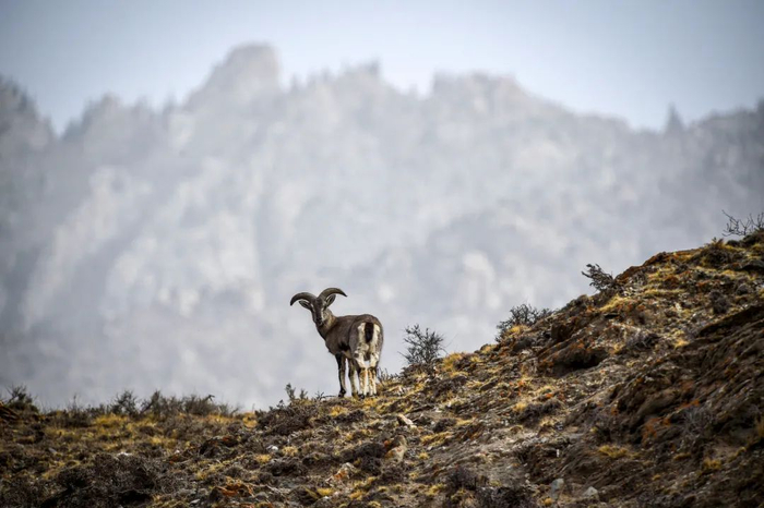 在宁夏贺兰山国家级自然保护区内,一只岩羊站立在峭壁上。冯开华摄(新华社)