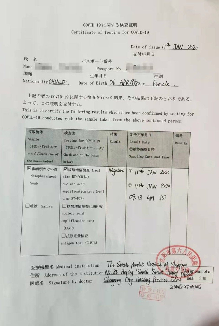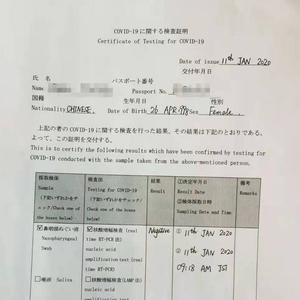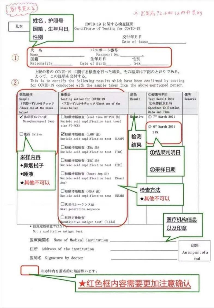 具体要求如下:请用日方规定的PCR检测模板,其内容须包含英文关键词,证明上必须有相关医疗单位的盖章。入境日本的检测方式,日方仅承认唾液检测以及鼻咽拭子检测。日方不承认口咽拭子(throat swab)以及鼻拭子(nasal swab)检测。