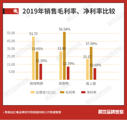 红餐品牌研究院的数据显示,2019年绝味鸭脖营收51.72亿元,销售净利率为15.29%,营收净利双双位列第一;周黑鸭营收31.86亿元,净利率为12.79%;煌上煌营收21.2亿元,净利率为10.69%。
