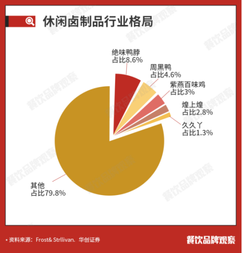 “2020中国卤味十大品牌”虽然都是行业头部品牌,但占领的市场份额并不多,前五名品牌市场占有率仅为20%左右。